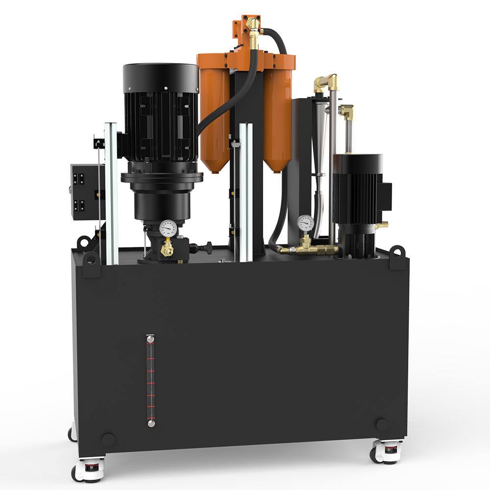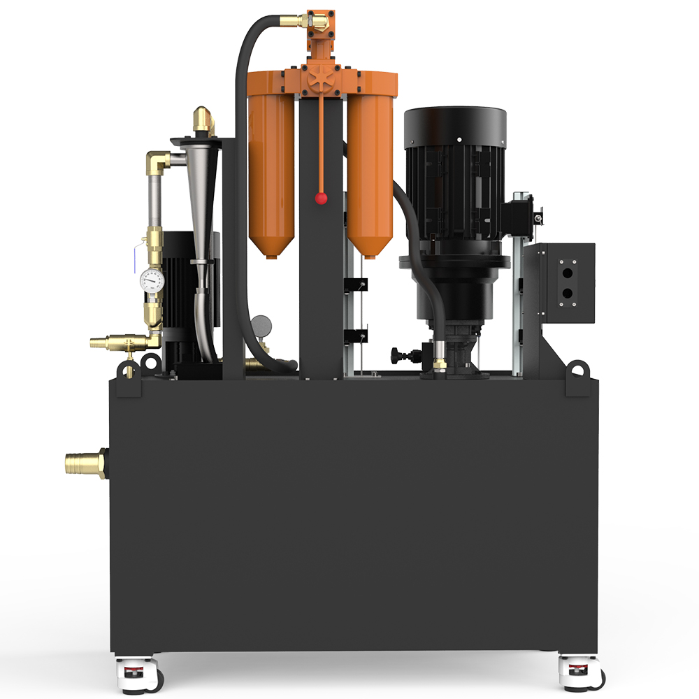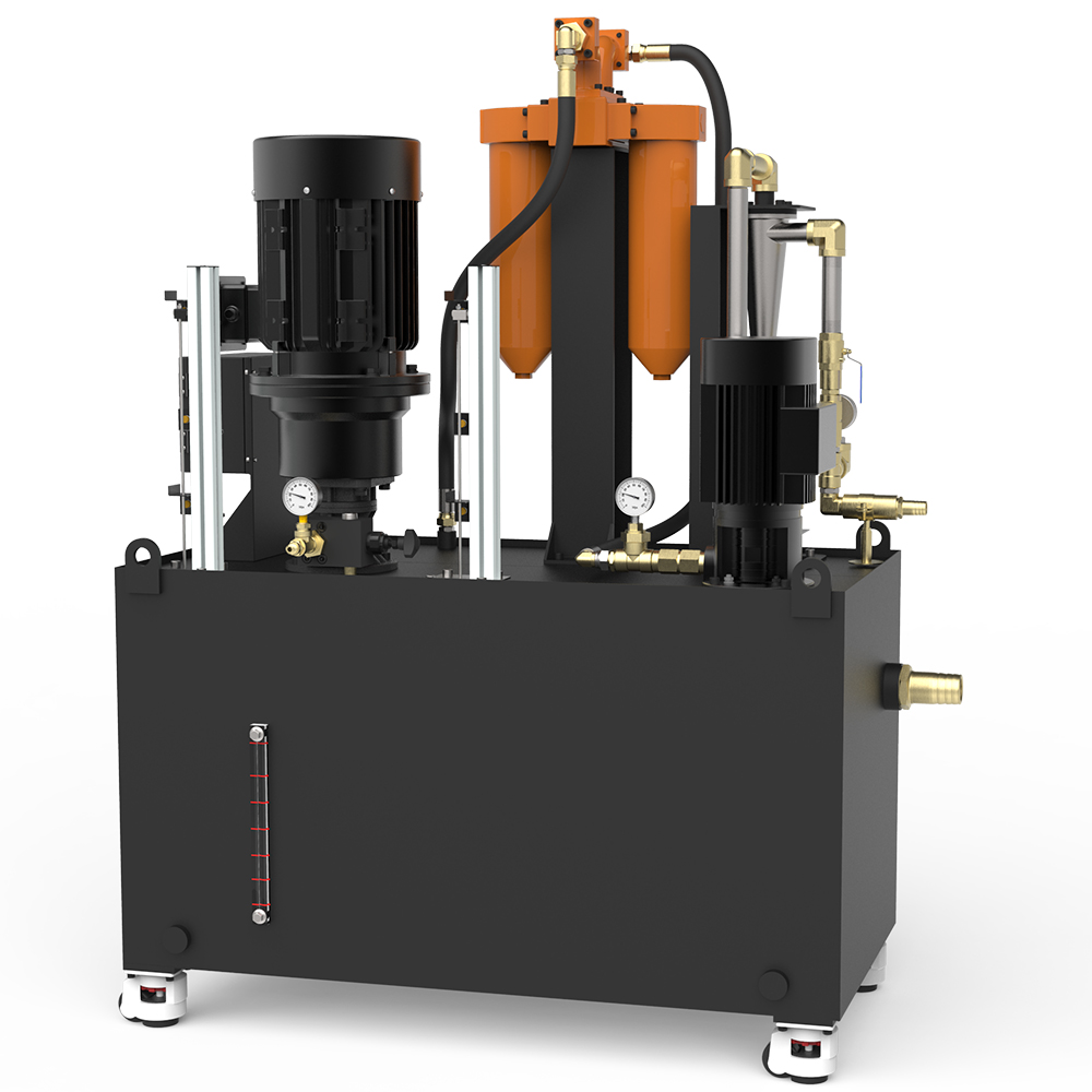 A3SS-XT7 double switch filter system Double cylinder filter can be used for 24 hours non-stop working conditions, under normal working conditions for single cylinder filter work, manually switch the filter mode when replacing the filter element, when a filter alarm, switch to another clean filter cylinder work, in principle can be realized online switch to replace dirty filter cylinder. The design method of the main and secondary water tanks, the liquid slag recovery device, and the lifting pump of the secondary water tanks are adopted. The filtration method of the first stage is vortex filtration. After the filtration of the secondary water tank is completed, the lift pump transmits the coolant to the double switch filter to the main water tank, which effectively ensures that the work is not shut down for 24 hours under harsh working conditions.